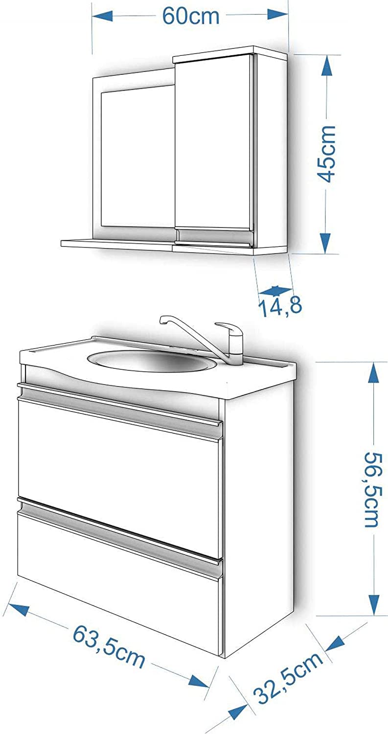 GABINETE para banheiro suspenso com ESPELHO, uma porta basculante e abertura com pistão à gás, uma gaveta com corrediça telescópica, ESPELHO com uma porta e duas prateleiras, puxadores em perfil alumínio, estrutura 100% MDF, amplo espaço interno, lavatório 100% mármore sintético com mais durabilidade e resistência.