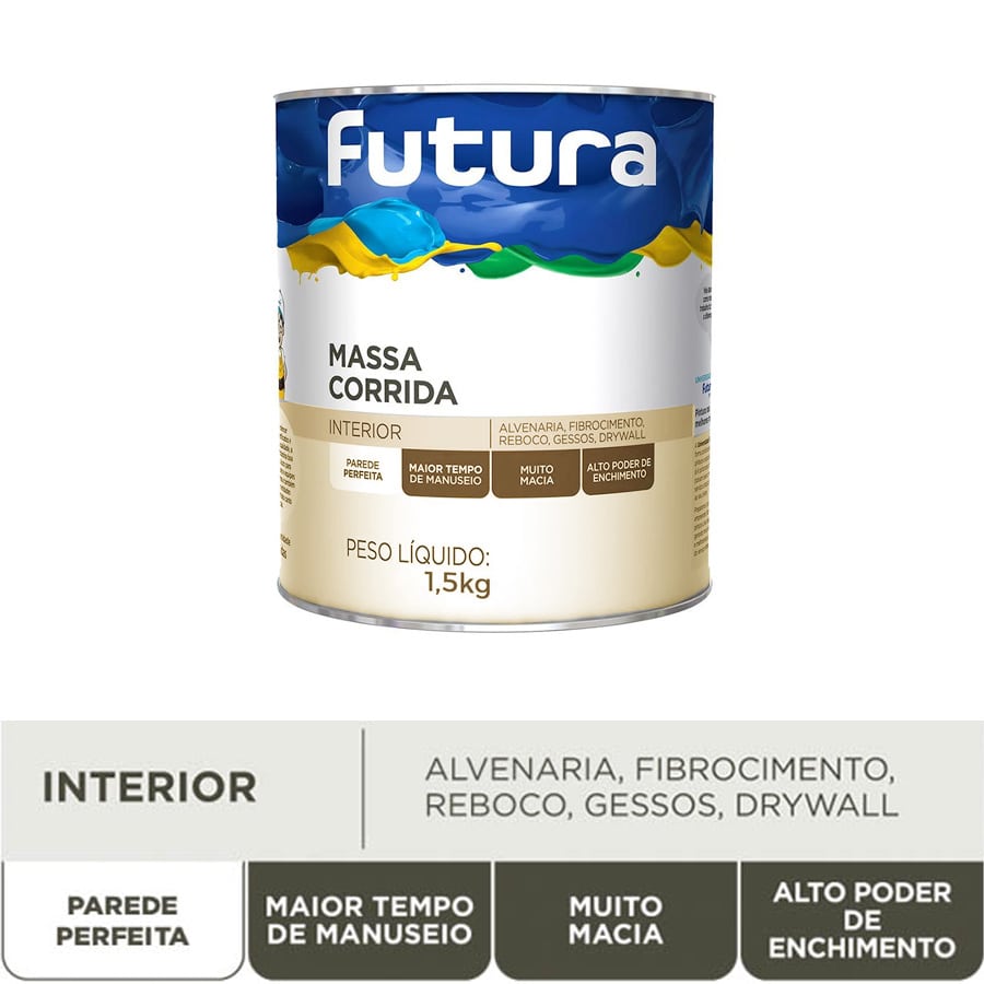Com a Massa Corrida Futura, você alcança resultados profissionais com praticidade. Sua fórmula de alta qualidade garante rendimento otimizado, cobrindo até 25m² por embalagem de 25kg, 5m² por embalagem de 5,6kg e 2m² por embalagem de 1,5kg.